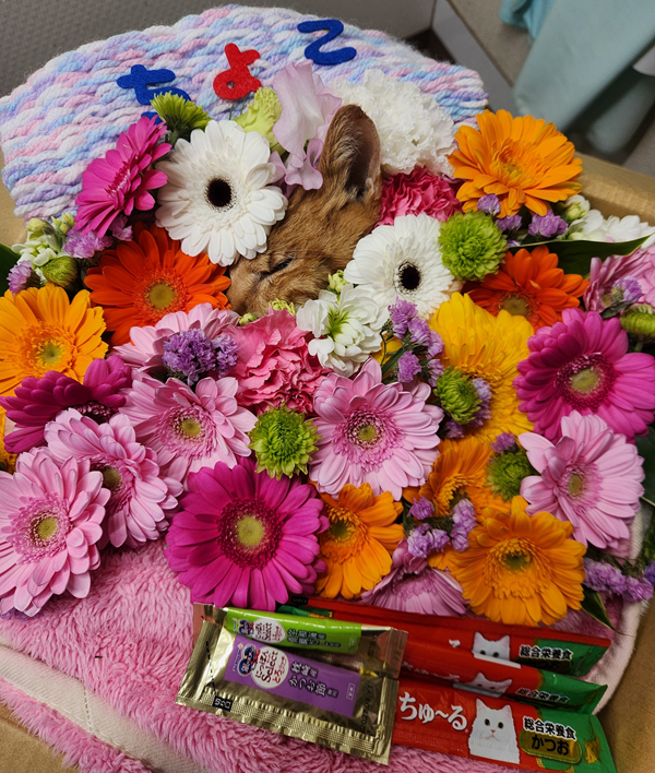 お花、ちゅ~るそして名前入りの手作りブランケットに包まれて…