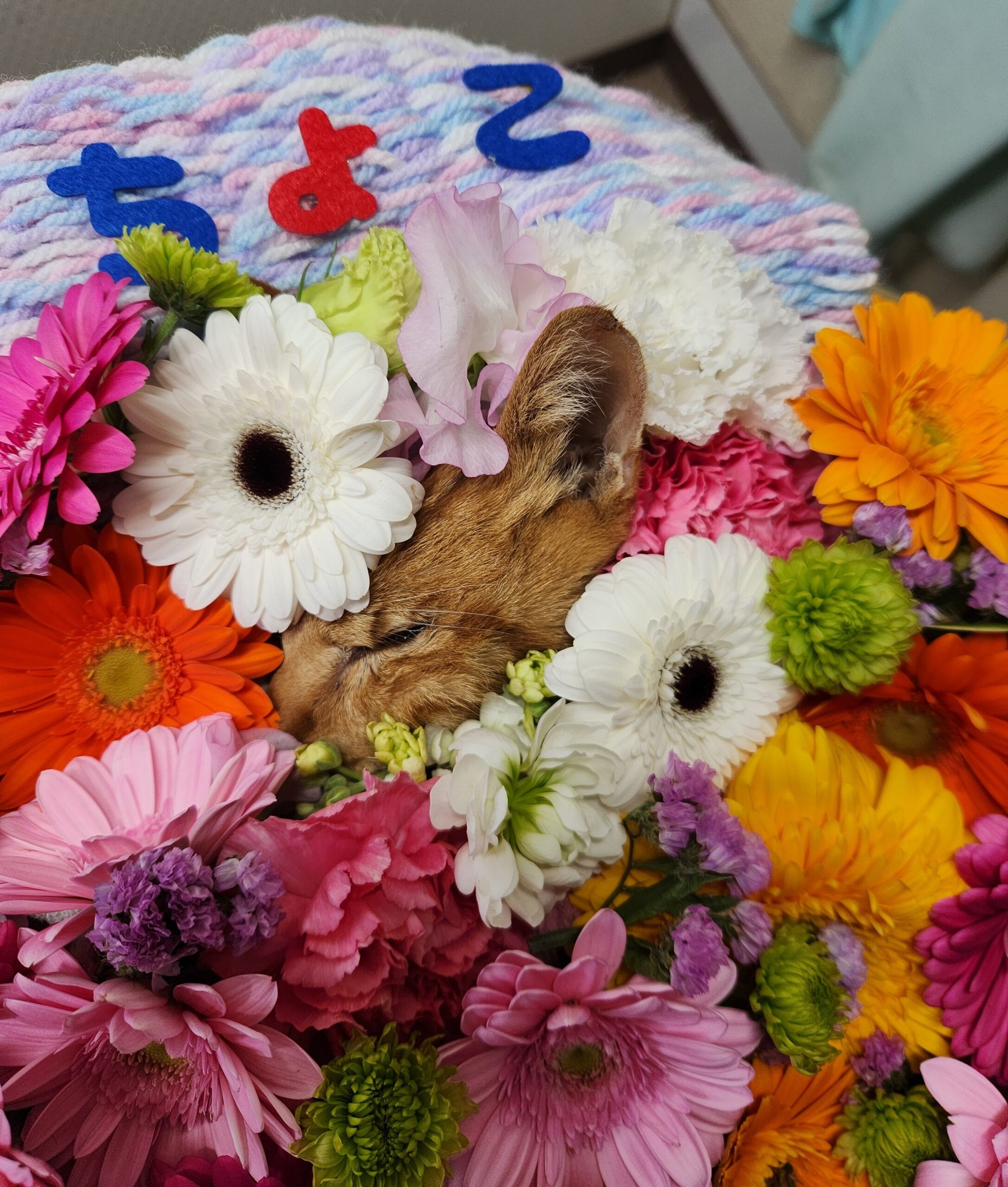 お花、ちゅ~るそして名前入りの手作りブランケットに包まれて…